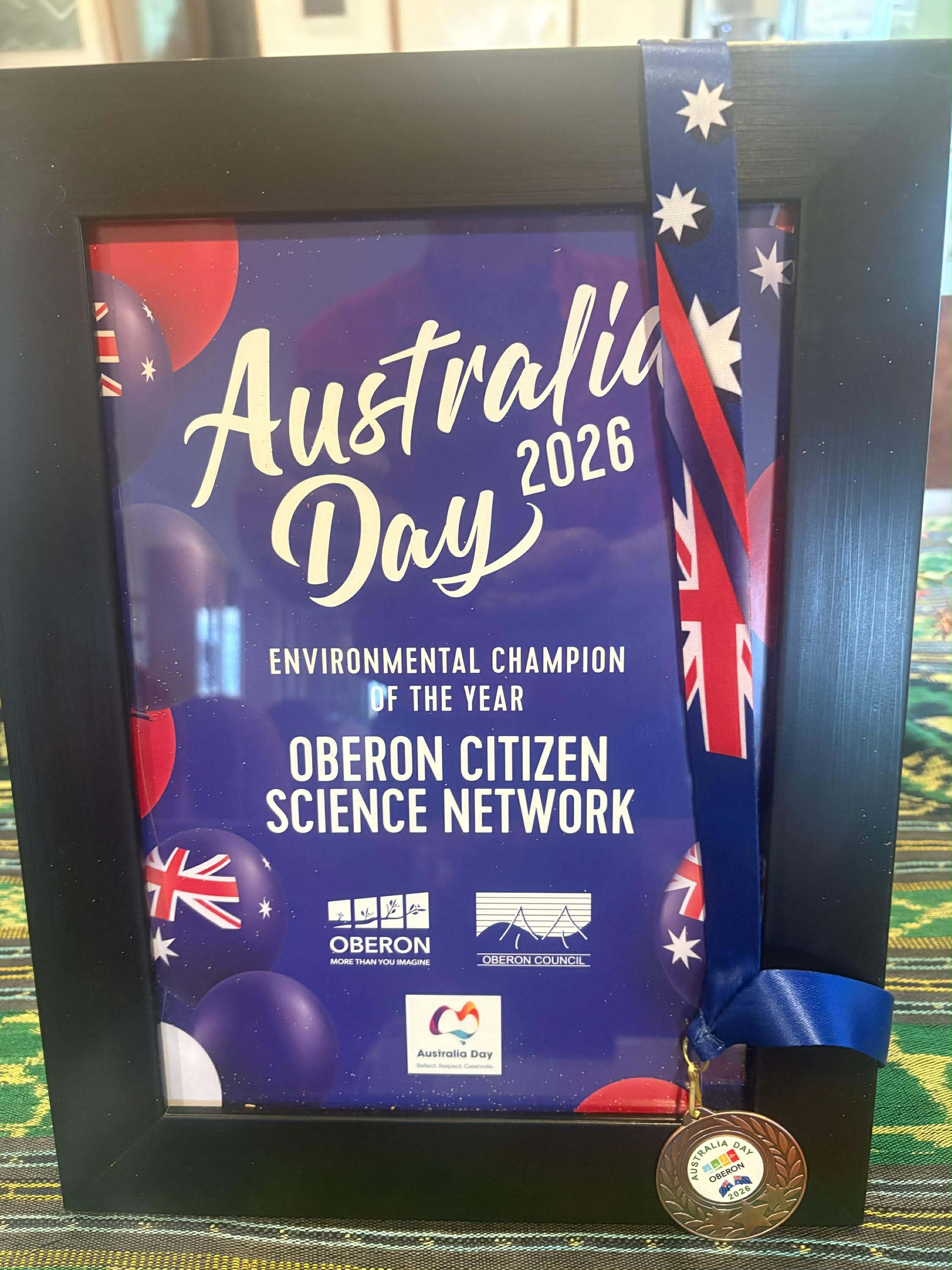 Oberon Citizen Science Network (OCSN) is pleased to report that it was presented with the Environmental Champion of the Year award by Oberon Council on Australia Day, 26 January 2026. We sincerely thank Oberon Council for this award, and Mayor McKibben for his kind and positive comments about our work at the awards ceremony. We also thank OCSN member Malcolm Graham for representing OCSN at the event and accepting the award, and for speaking briefly about our activities at the ceremony. We also thank the anonymous person who nominated OCSN for this award.