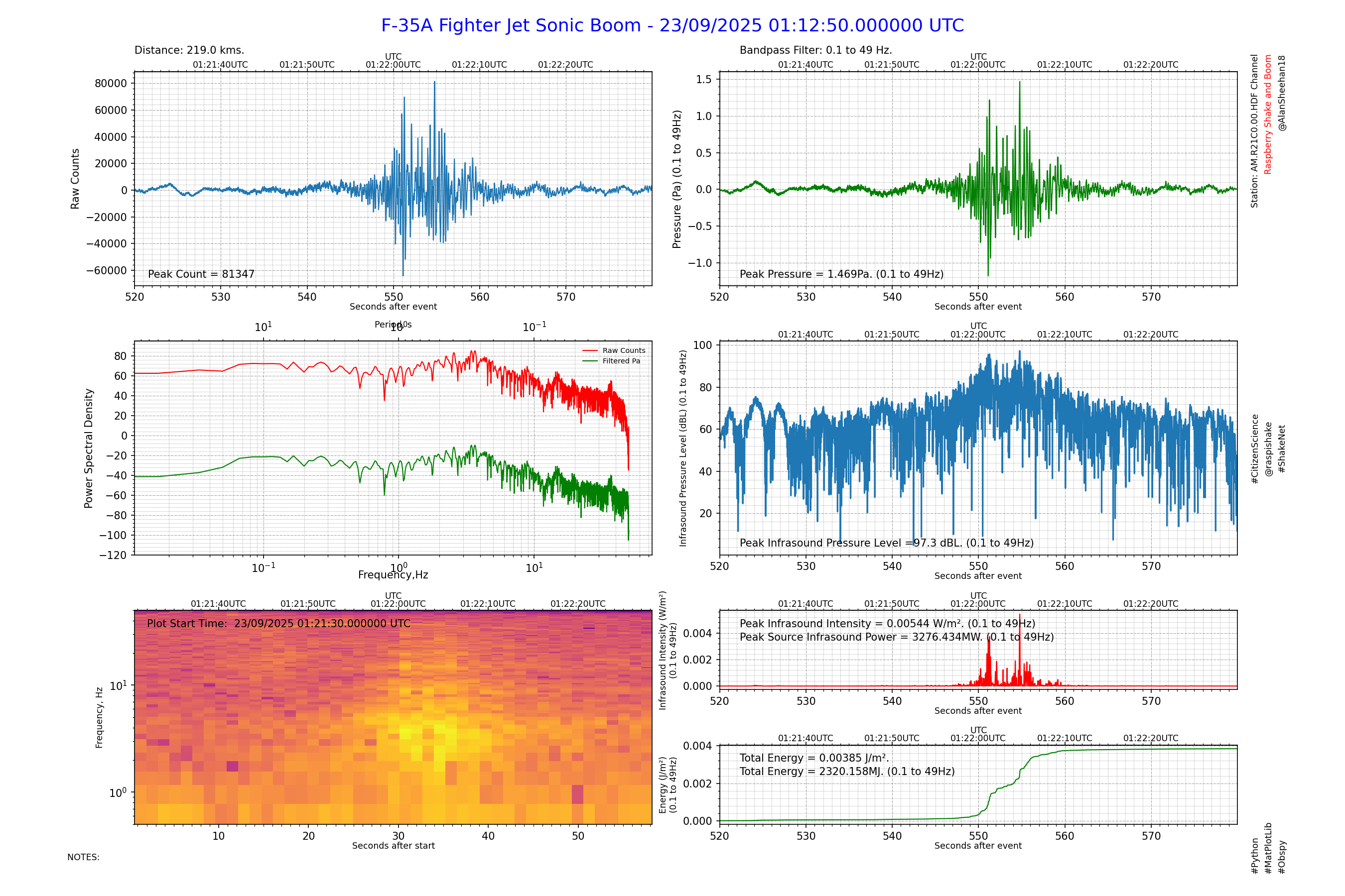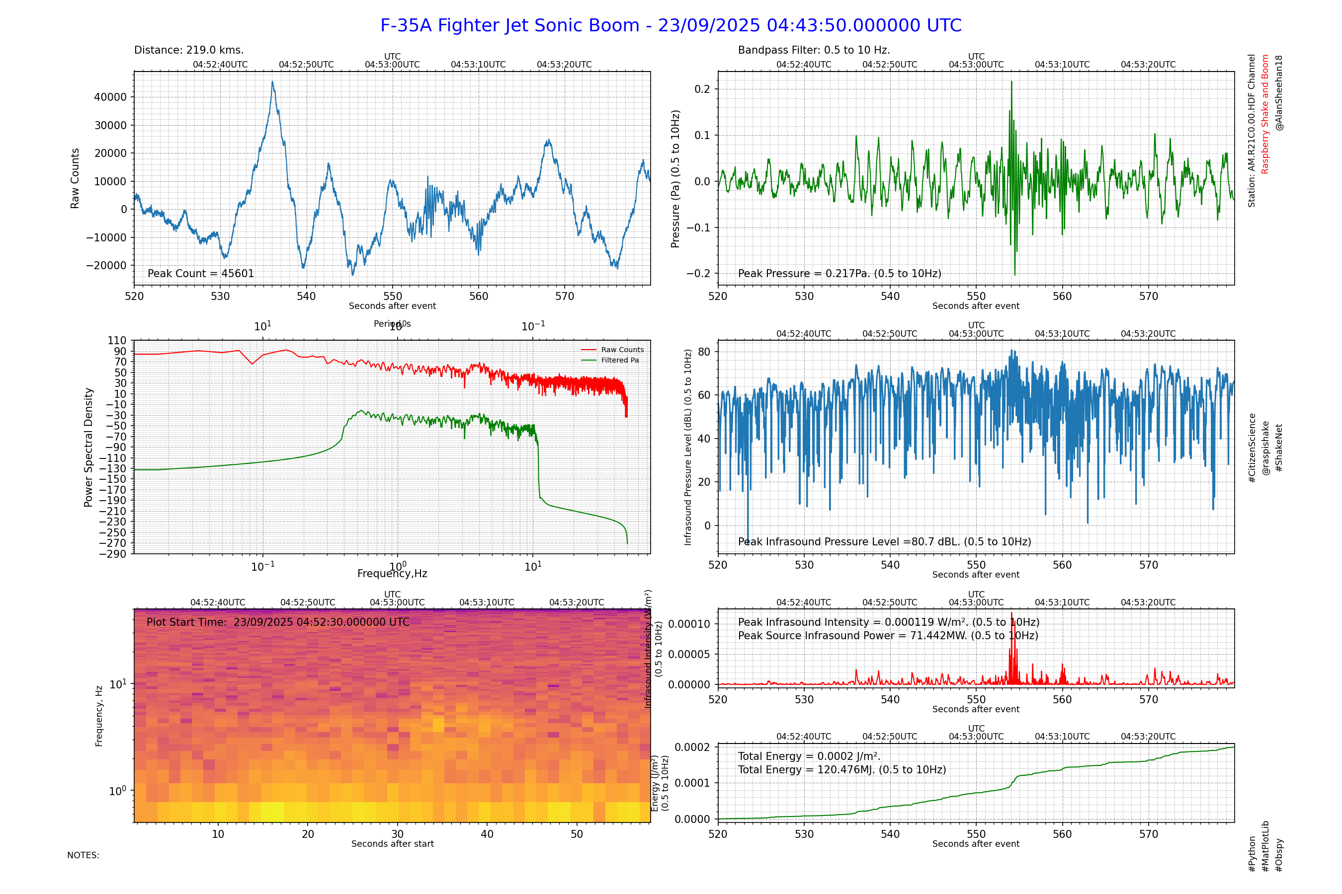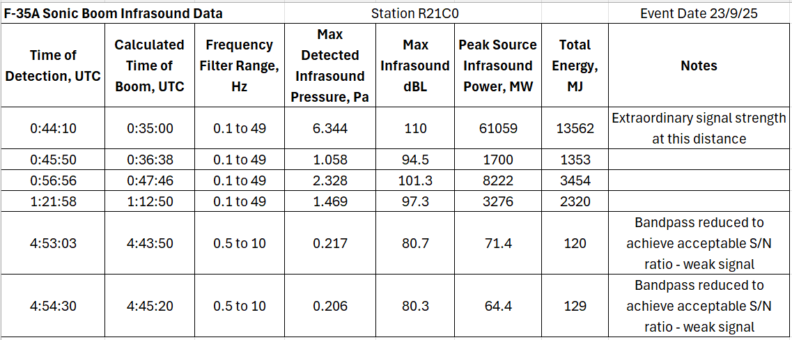 The Boom Report is designed to calculate as much information from an infrasound signal as reasonably possible, but when it comes to calculating the Peak Source Infrasound Power and the Total Energy (infrasound) it assumes an omni-directional point source. Sonic Booms are not omni-directional, so the Peak Source Infrasound Power and the Total Energy (infrasound) figures may likely be inflated (they can also be diminished depending on the direction of flight of the aircraft). So not too much can be drawn from these figures.
