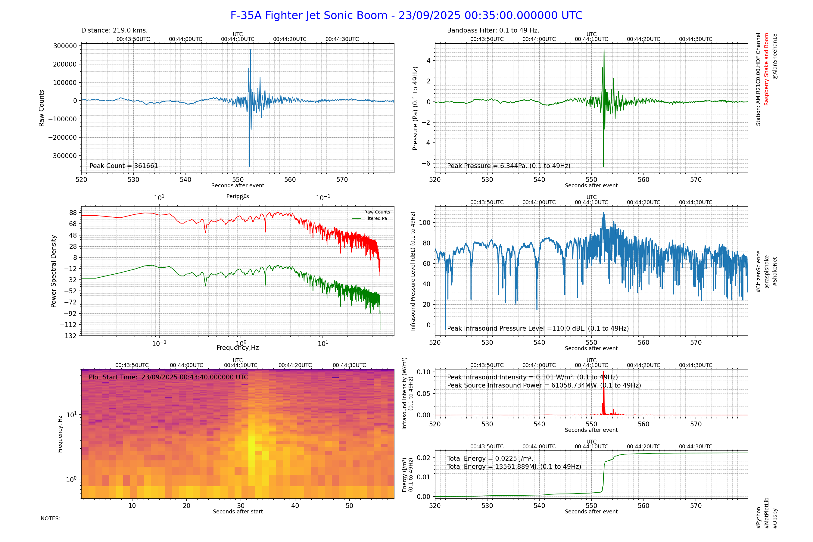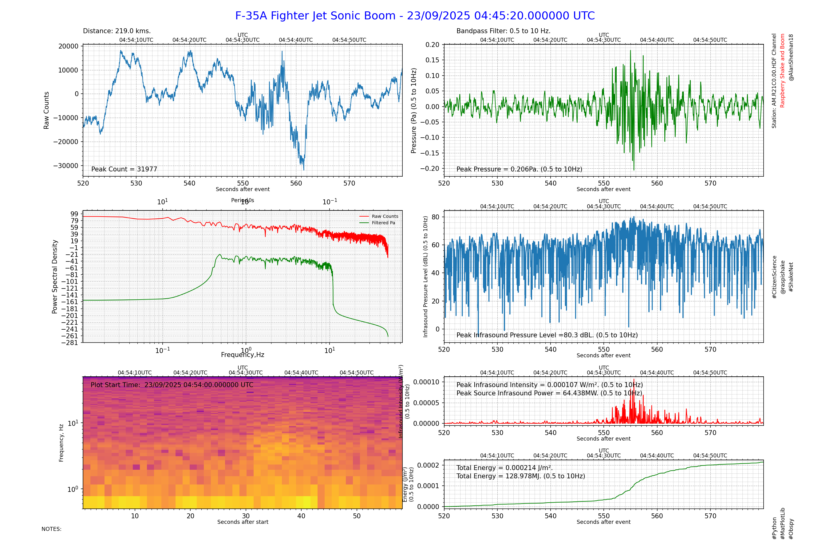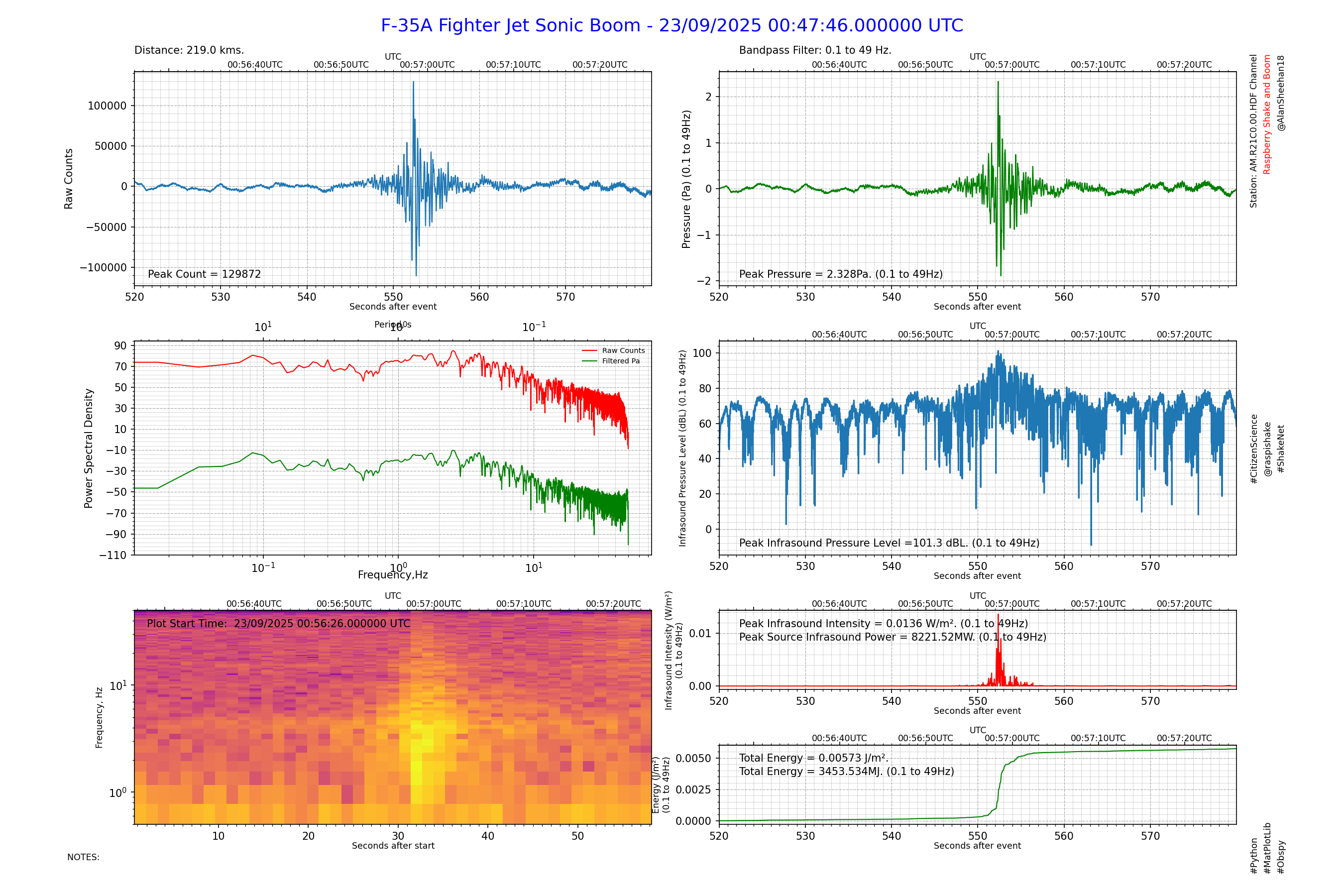 The Boom Report is designed to calculate as much information from an infrasound signal as reasonably possible, but when it comes to calculating the Peak Source Infrasound Power and the Total Energy (infrasound) it assumes an omni-directional point source. Sonic Booms are not omni-directional, so the Peak Source Infrasound Power and the Total Energy (infrasound) figures may likely be inflated (they can also be diminished depending on the direction of flight of the aircraft). So not too much can be drawn from these figures.