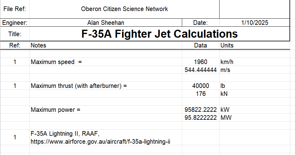 For example, the F-35A fighter power can be calculated as above. About 96MW for maximum power, but it can produce this for a long time in comparison to the duration of a sonic boom.