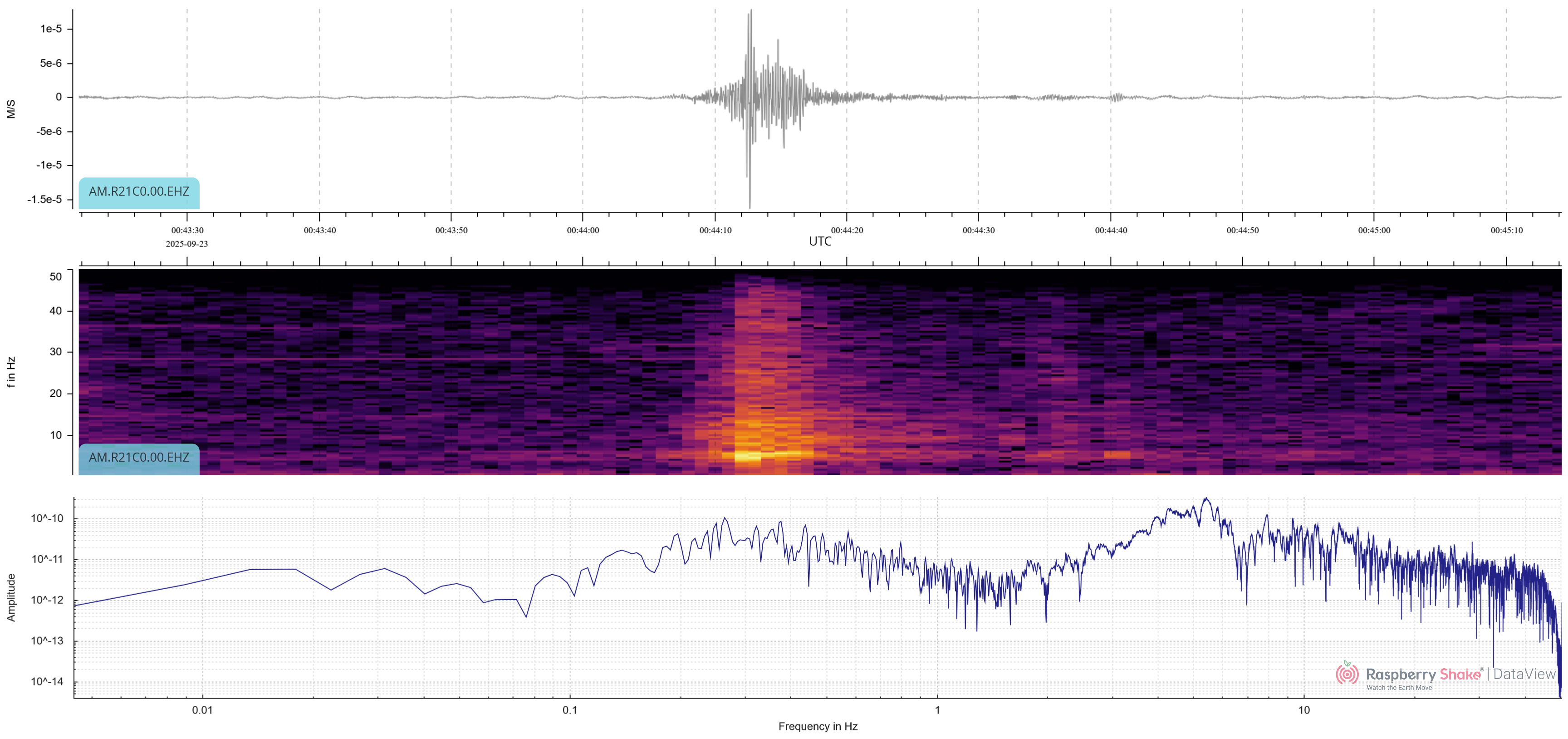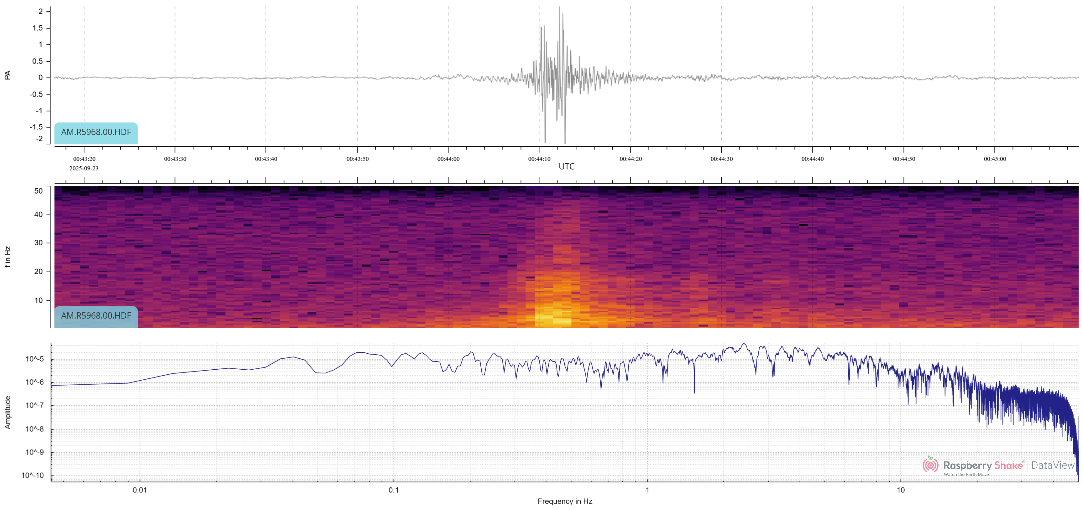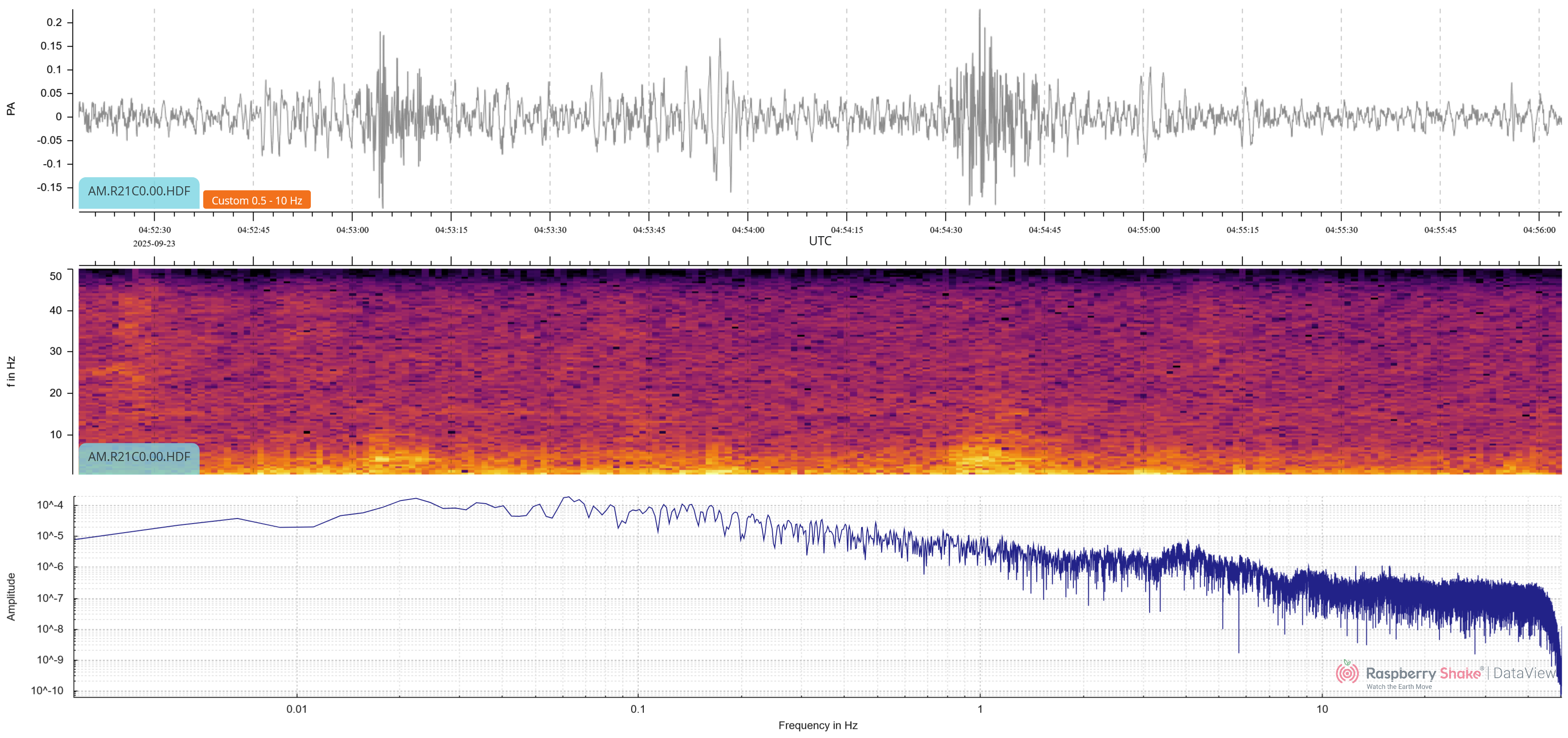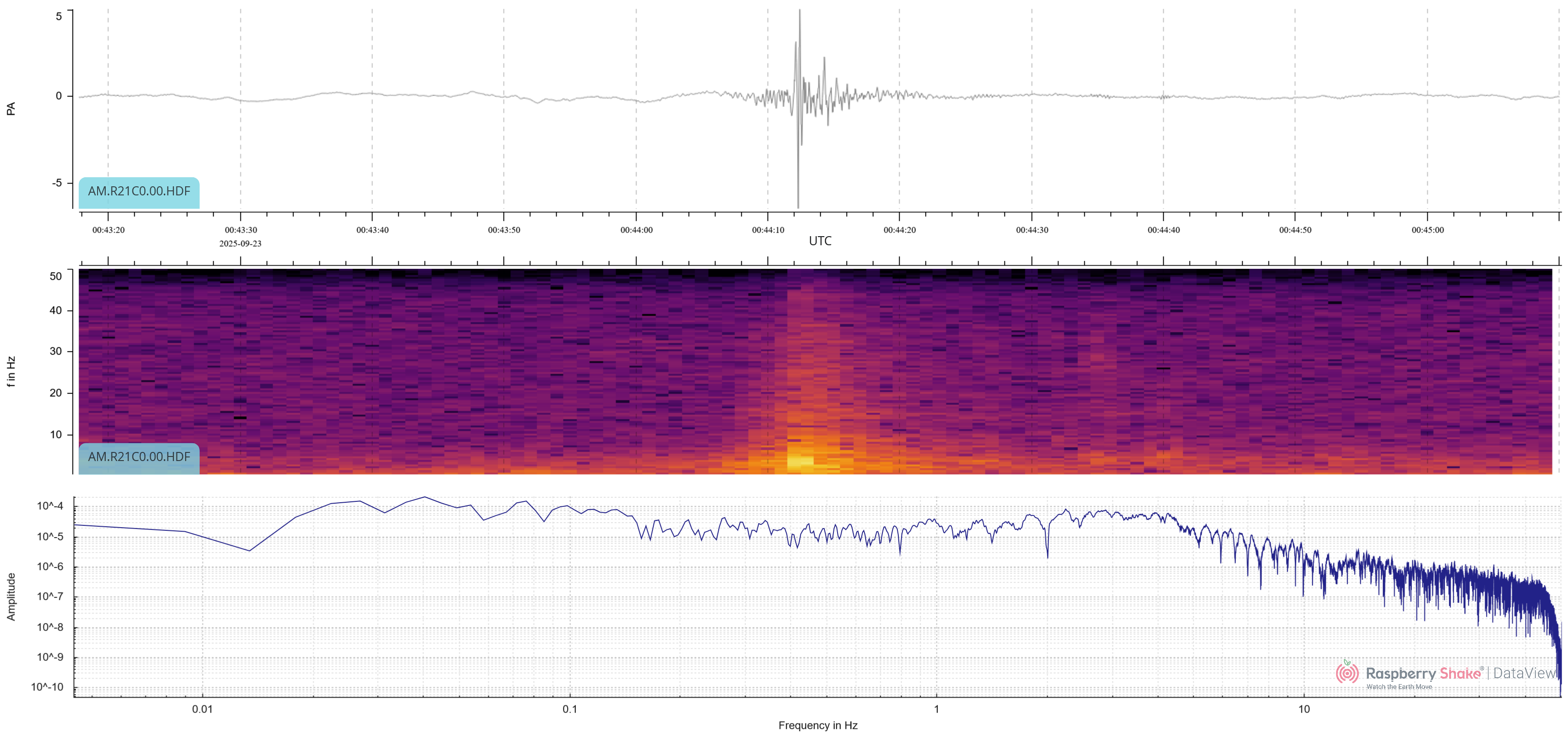 It’s Tuesday September 23, 2025 and with a little bit of spare time I browse through the helicorder plot of my Raspberry Shake and Boom looking for interesting signals. I find a possible small local earthquake (or more likely a mine blast but I won’t know until I locate it) on the EHZ (vertical ground motion) channel and I find an unusual signal in the infrasound (HDF) channel of station R21C0.