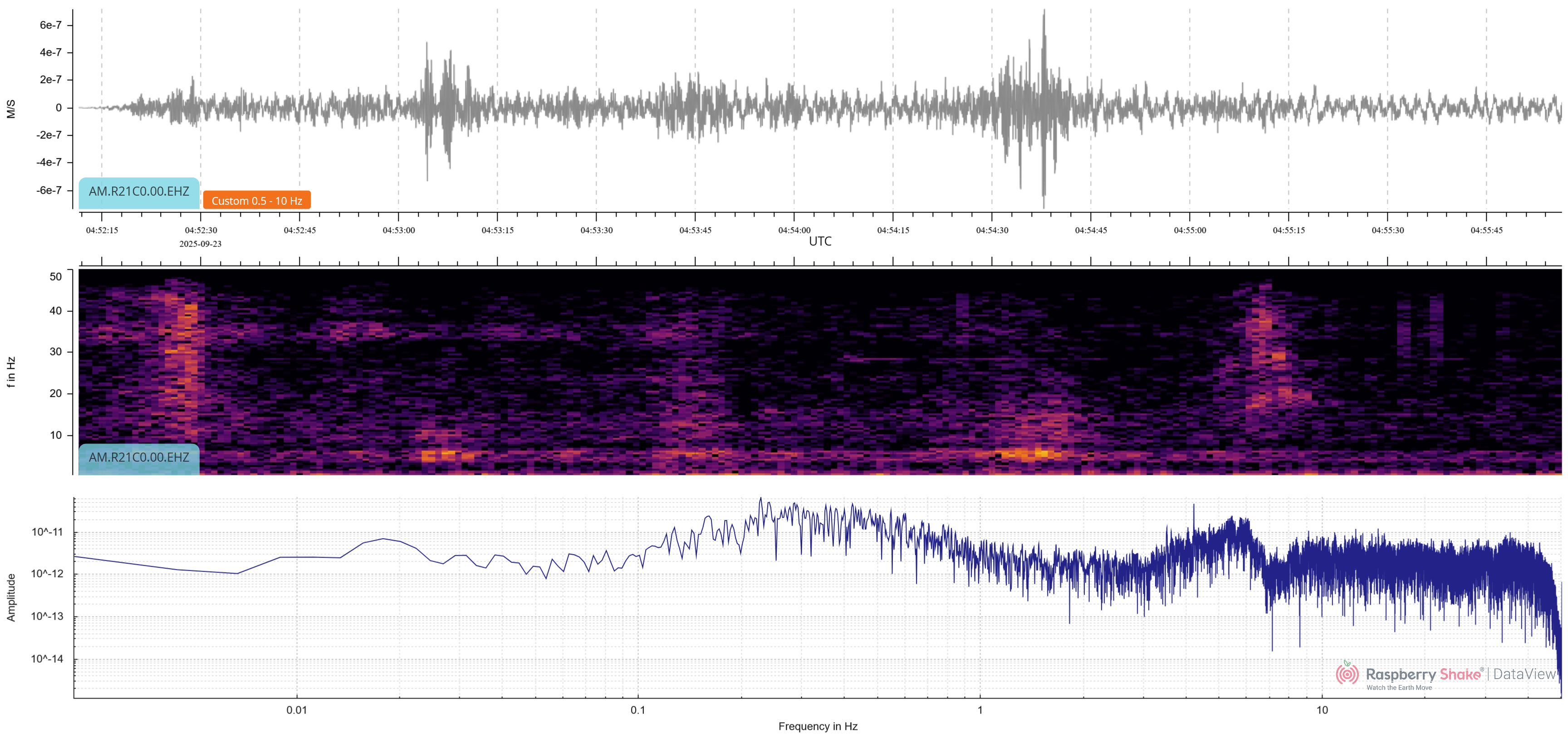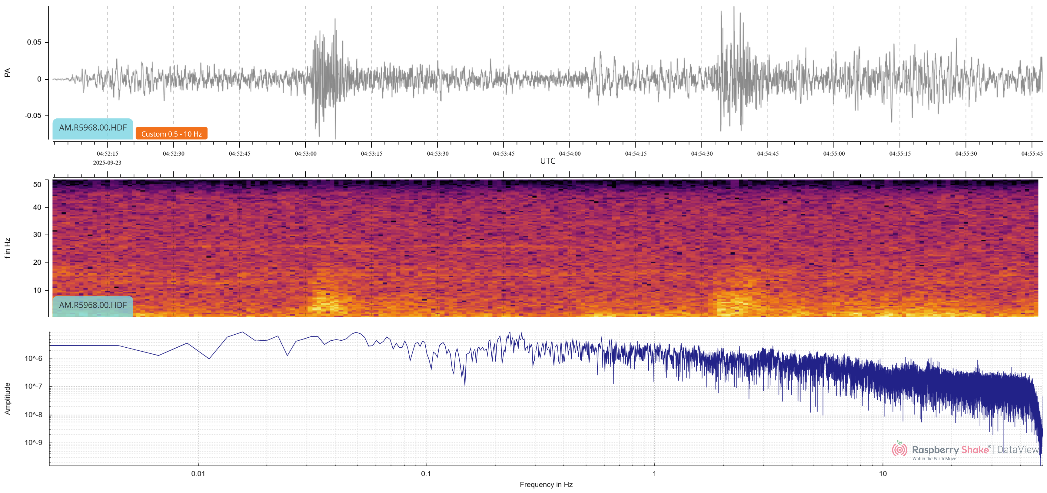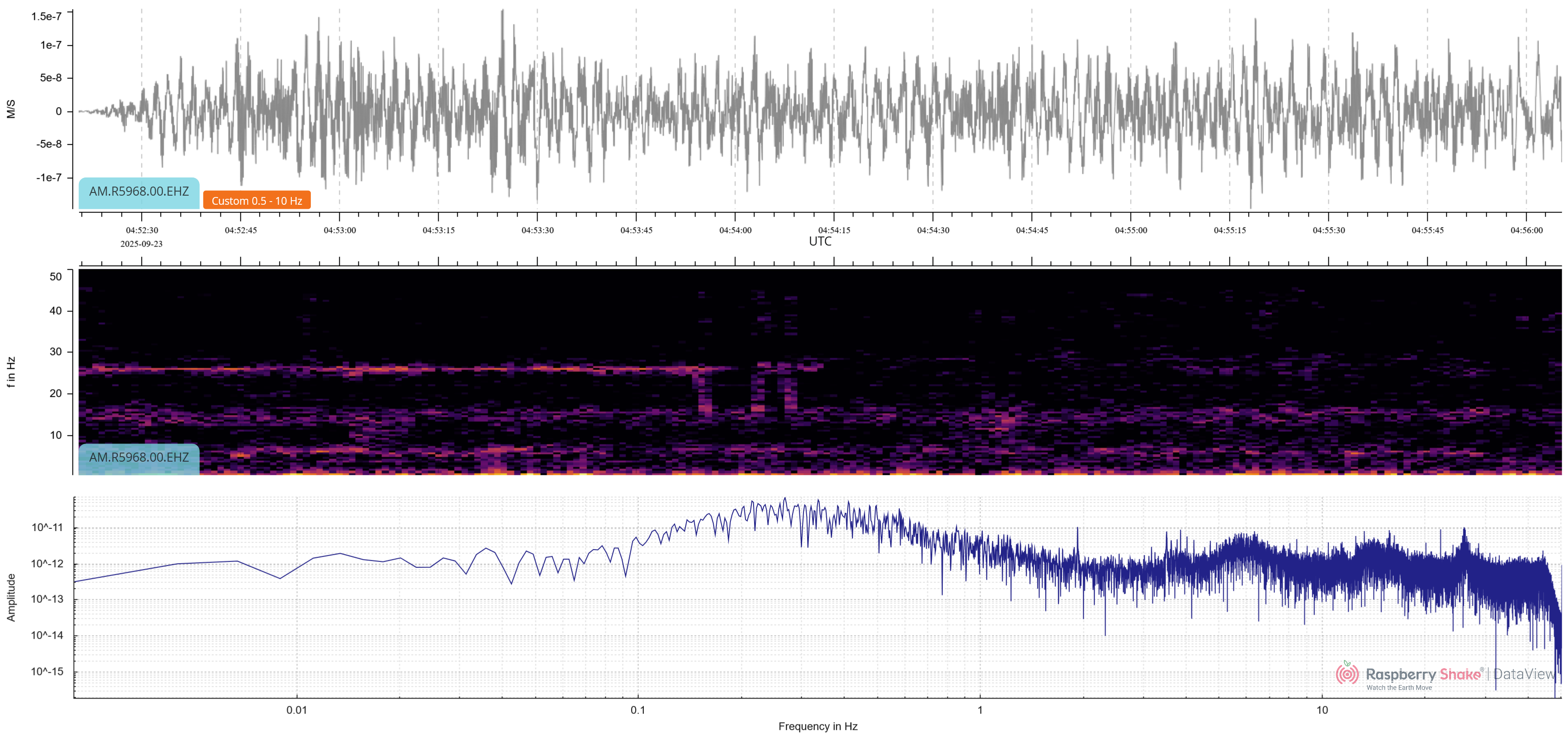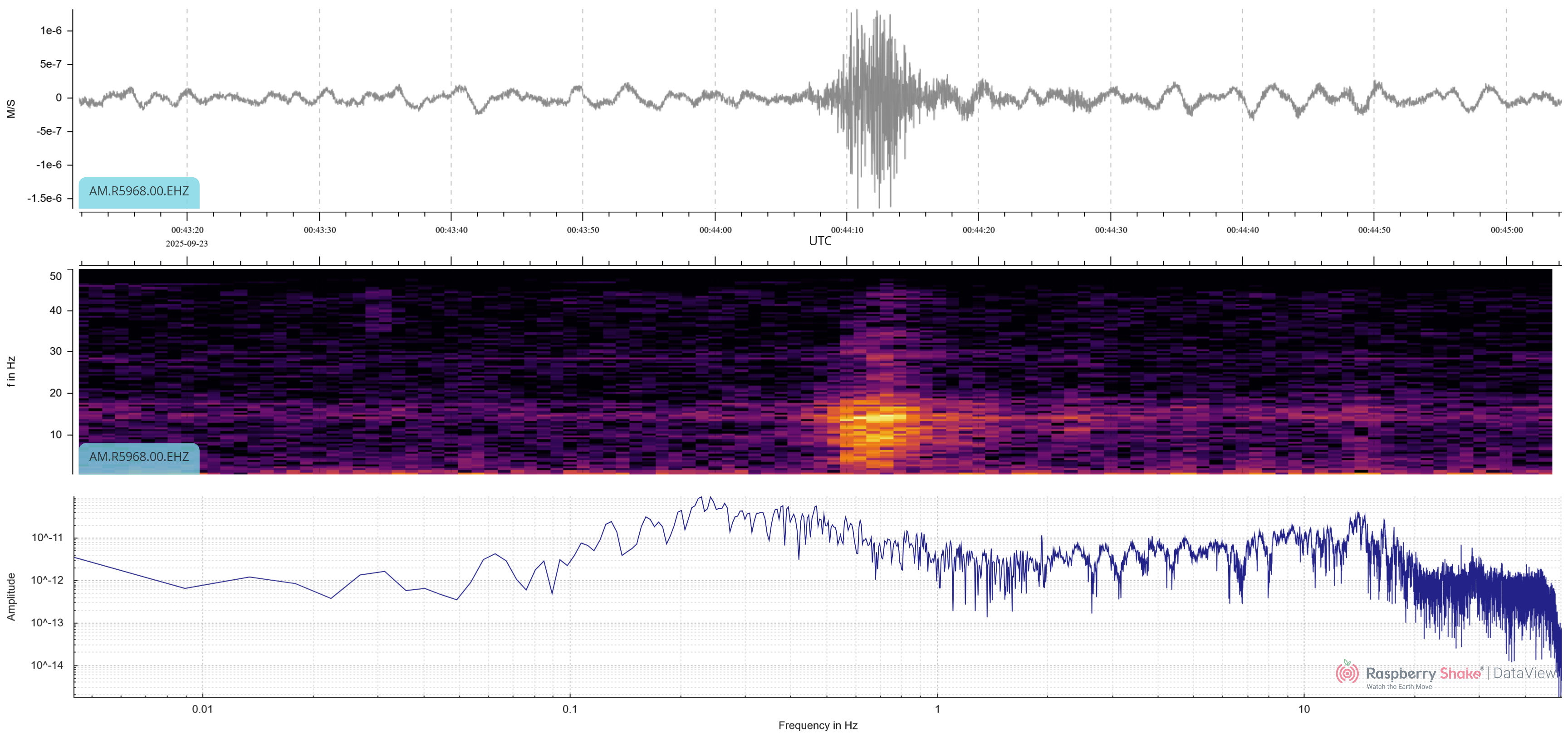 It’s Tuesday September 23, 2025 and with a little bit of spare time I browse through the helicorder plot of my Raspberry Shake and Boom looking for interesting signals. I find a possible small local earthquake (or more likely a mine blast but I won’t know until I locate it) on the EHZ (vertical ground motion) channel and I find an unusual signal in the infrasound (HDF) channel of station R21C0.
