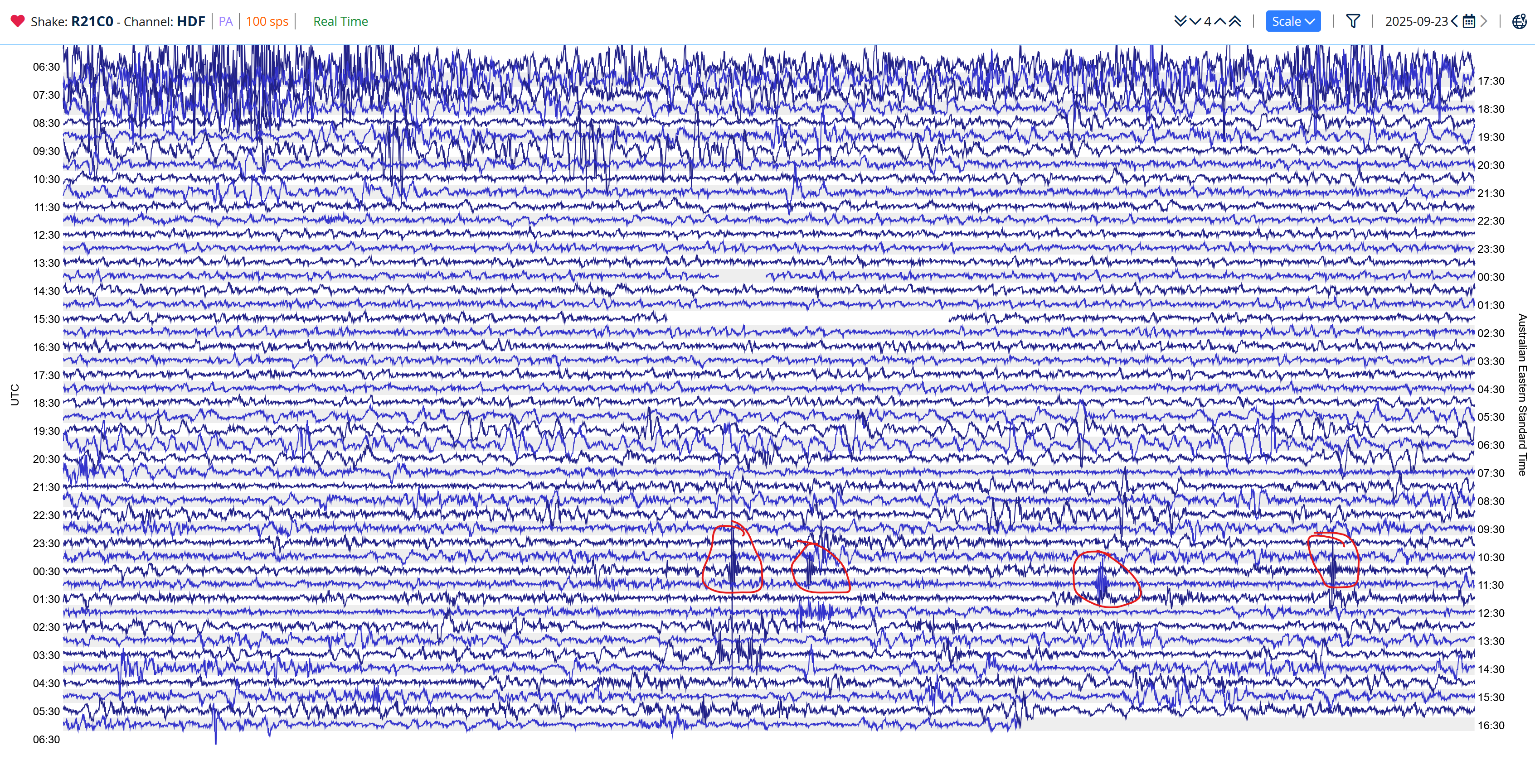 I check the next nearest Raspberry Shake and Boom, station S877D at Coonabarabran, but unfortunately there’s no signal detected there. That’s disappointing as at least 3 stations are required to try to pinpoint the source of the signal.