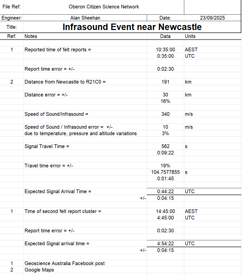 Calculation of the expected travel time suggests the signal should be near 00:44:22 UTC… and, what do you know… it corresponds with the unusual infrasound signal I’d noted before! The arrival was recorded at about 00:44:10UTC well within the error band for the calculations. This is encouraging - it may simplify identifying the source of the signal. While working out the distance from Newcastle I also check that the path of travel is indeed roughly perpendicular to the line between stations R21C0 and R5968.